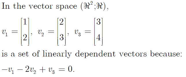 한국말로 풀어쓰자면, vector space 안에 있는 vector들로 이루어진 set이 있을 때, 이 set을 이루는 vector들의 선형조합으로 0을 만들 수 있으면 linearly dependent하다고 말할 수 있습니다.