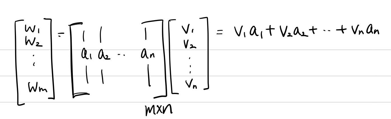 벡터 v는 A의 column에 대한 가중치이자, scalar 곱이고 그 결과로, 벡터 w를 표현할 수 있는 것입니다. 아래의 손필기를 참고해주세요.