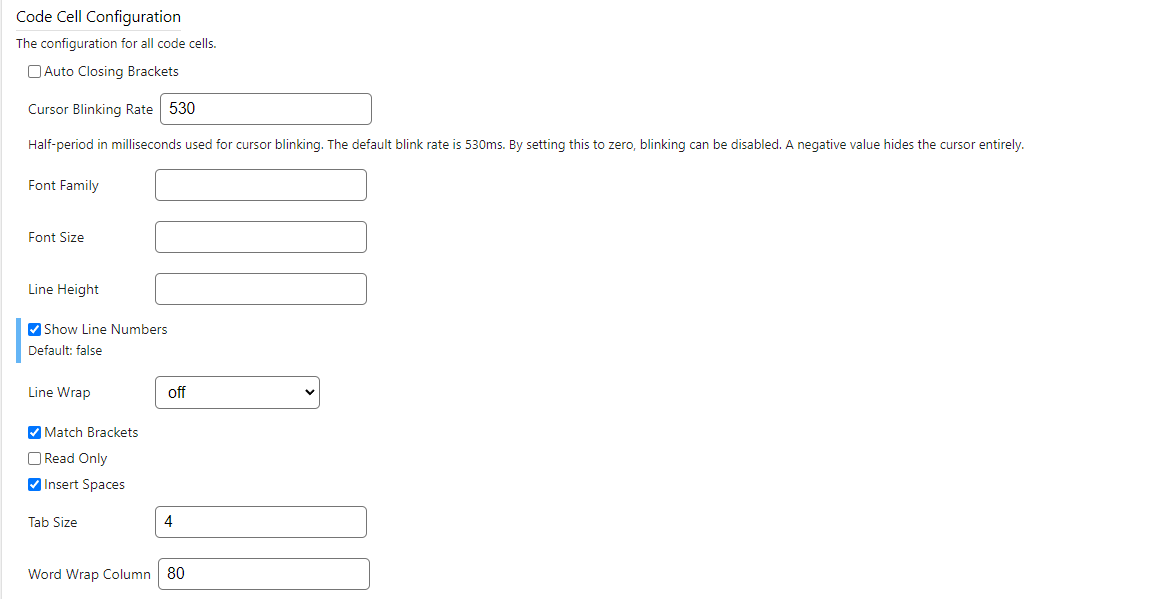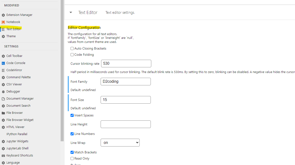 다음과 같이 code cell configuration이 있는데 여기서 Font family를 원하는 폰트 명으로 넣어준다.