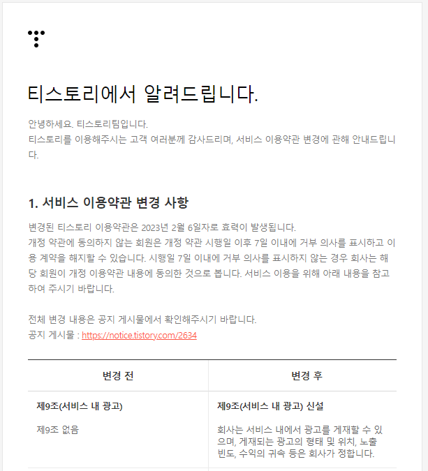 안녕하세요. 티스토리팀입니다. 티스토리를 이용해 주셔서 감사합니다. 티스토리 이용약관이 2023년 2월 6일부터 아래와 같이 개정될 예정임을 안내 드립니다. 블로그 운영에 참고 바랍니다. 1.