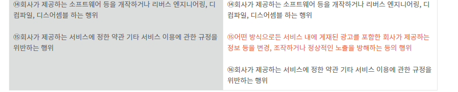 10조의 경우에는 15항을 추가하여 회사가 붙이는 광고를 안 보이게 하거나 방해하는 등의 행위를 하지 말라는 것이었다.