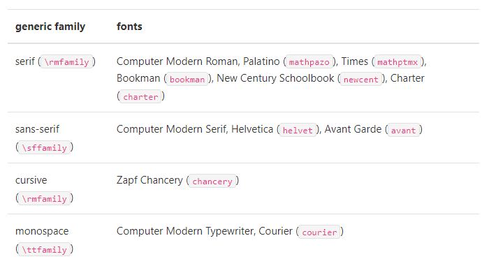 그 다음으로는 LaTeX를 쓸 때 텍스트 렌더링이다. 공식 문서에서는 다음과 같은 폰트 패밀리를 제공해주는 것으로 보인다.