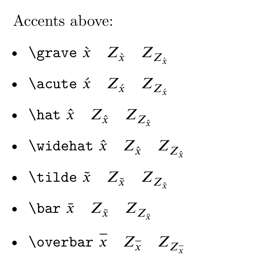 수학에 많이 쓰이는 accent는 다음과 같다. 이 accents들을 여러 개 쌓아서는 안된다. German 또는 script letter에도 accent를 쓸 수 있는데 권장되지는 않는다.