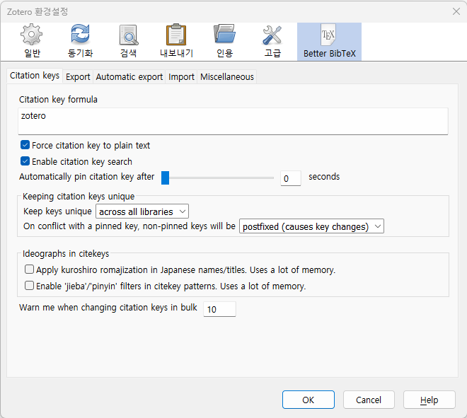 citation key formula에서 [zotero]로 바꿀 수 있다. 그 다음에 ok를 눌러도 export하면 zotero 형식으로 바뀌지 않을 것이다.