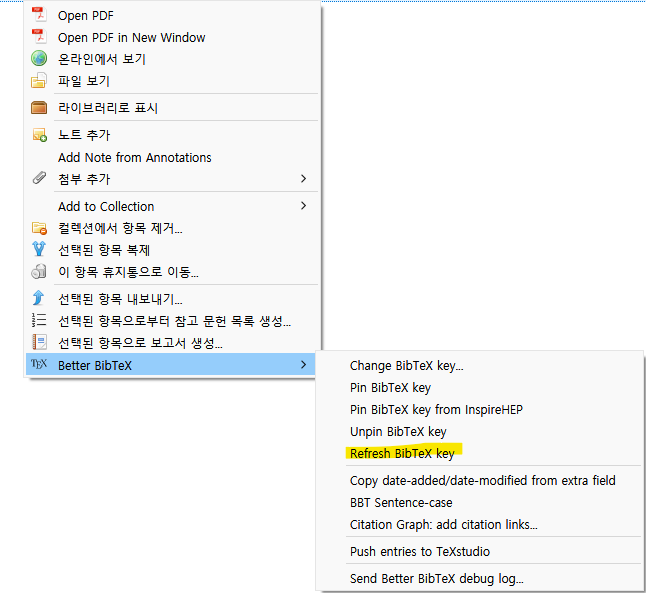 참고문헌을 마우스 우클릭해서 다음과 같이 refresh BibTeX key를 누르면 된다.