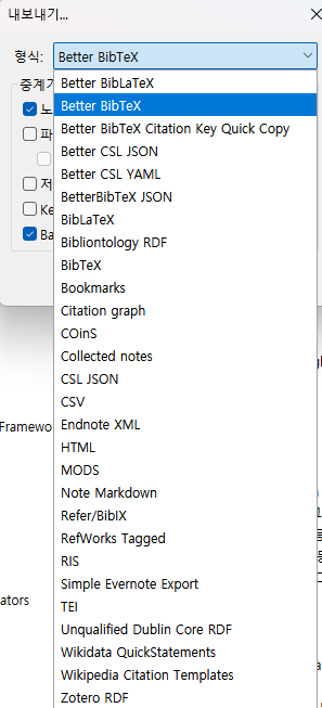 이전과 달리 Better BibTeX가 새로 추가되어있다. 이대로 [Better BibTeX]를 선택해서 내보내면 자동으로 title case로 저장이 된다.