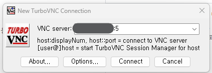 다음을 터미널에 입력하면 포트 번호를 알려준다. 그 번호를 위의 turboVNC viewer에 입력한 다음에 connect를 누르면 된다.