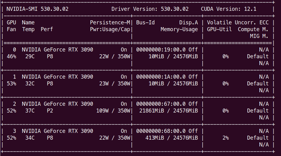 다음과 같이 JAX는 처음에 import할 때 90퍼센트 가까이 preallocation하기 때문에 위와 같이 세 번째 gpu의 메모리가 차지된 것을 확인할 수 있다.