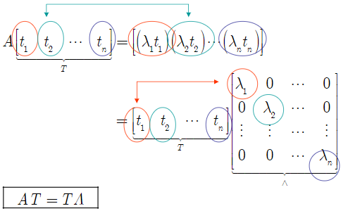 만약에 eigenvectors들도 구성된 matrix $T=\begin{bmatrix} t_{1}& t_{2} & \cdots & t_{n} \end{bmatrix}$이 있다면, 이 matrix는 nonsingular입니다.
