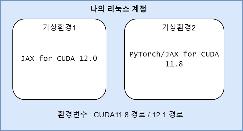 비록 JAX 버전을 CUDA12에 맞게 설치했다해도 11.8버전 경로가 먼저 있기 때문에 그 안에서 cuDNN을 찾다가 자꾸 cuDNN 8.8.0을 만나서 문제가 되었던 것이었다.