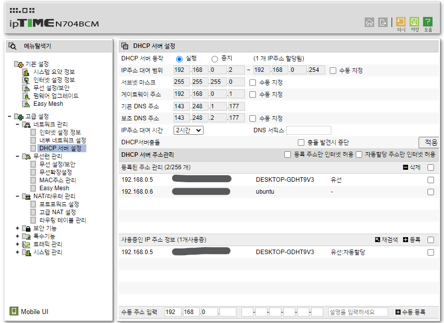 설정을 완료하면 아래와 같이 포트포워드 설정과 DHCP 설정을 완료한다.