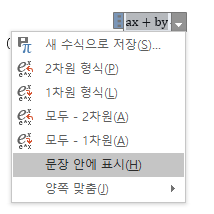 word 수식으로 수식을 작성한 다음에 문장 안에 삽입한다. 아래와 같이 문장 안에 표시를 클릭.