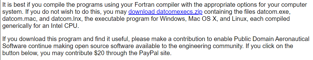 하이퍼링크로 연결된 datcomexecs.zip을 다운받아서 썼다. 나처럼 Fotran compiler가 안되는 경우에는 datcomexecs.zip을 다운받으면 된다.