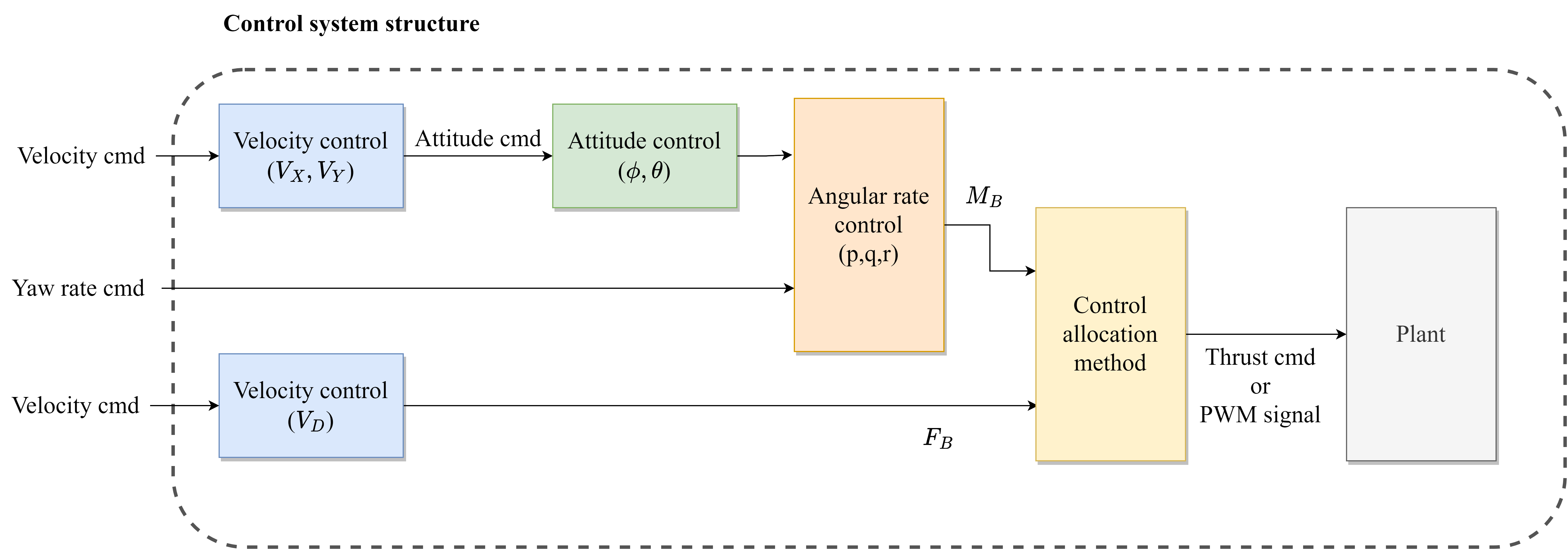 따라서 아래 그림과 같이 속도 제어 - 자세 제어 - 각속도 제어 순서로 제어를 하게 된다.