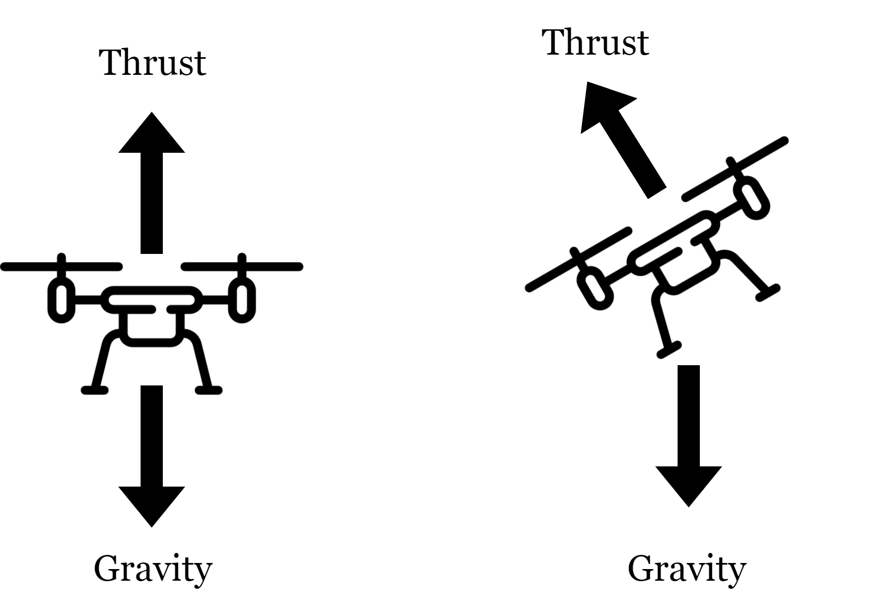 종합해서 보면 x,y,z 축으로 움직이는 경우, 즉 평면 상과 고도 상으로 움직이고 싶은 경우에는 로터 자체의 추력을 바꿀 수 있다. 하지만 x,y를 변화시키고 싶으면 추력의 크기 뿐 아니라 자세각을 조절해야한다.