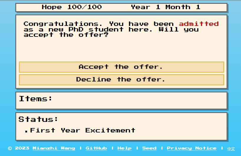 PhD Simulator - A Text-Based Game by Mianzhi Wang