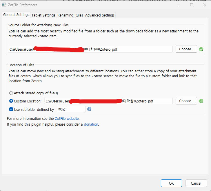 그리고 Use subfolder defined by는 파일 추가할 때 하위 폴더를 어떻게 만들 것인지에 대한 설명인데 나는 그냥 콜렉션 이름 안에 다 넣으려고 했기 때문에 저렇게 설정했다. 자세한 내용은 위의 zotfile 사이트에서 찾아보면 된다.
