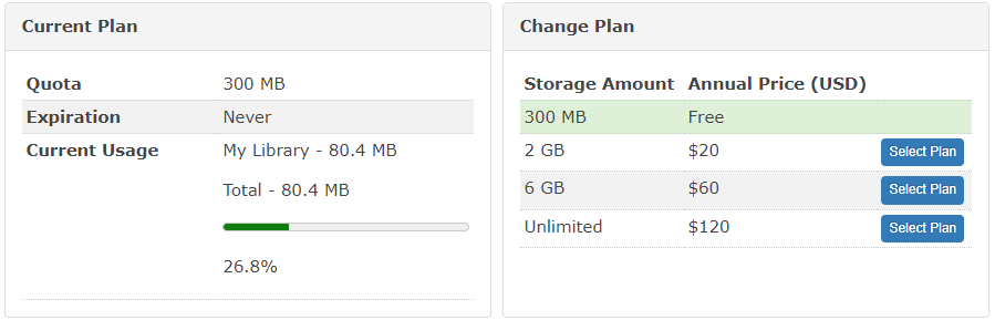 그러나 이 zotero의 싱크 기능은 300mb로 제한이 되어있고 추가로 유료결제를 통해 용량을 늘릴 수 있다.