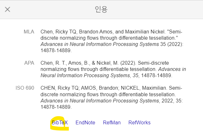 본인이 서지프로그램(endNote, Zotero, Mendeley 등)을 쓰고 있다면 bib 파일을 출력해서 쉽게 사용할 수 있지만