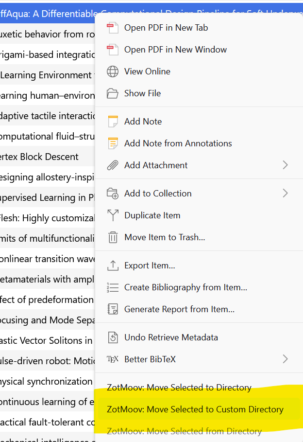 추가된 논문에 우클릭을 하면 ZotMoov:Move Selected to Directory를 확인할 수 있다. (하이라이트가 잘못됐는데 지정한 directory로 옮기고 싶었다.)
