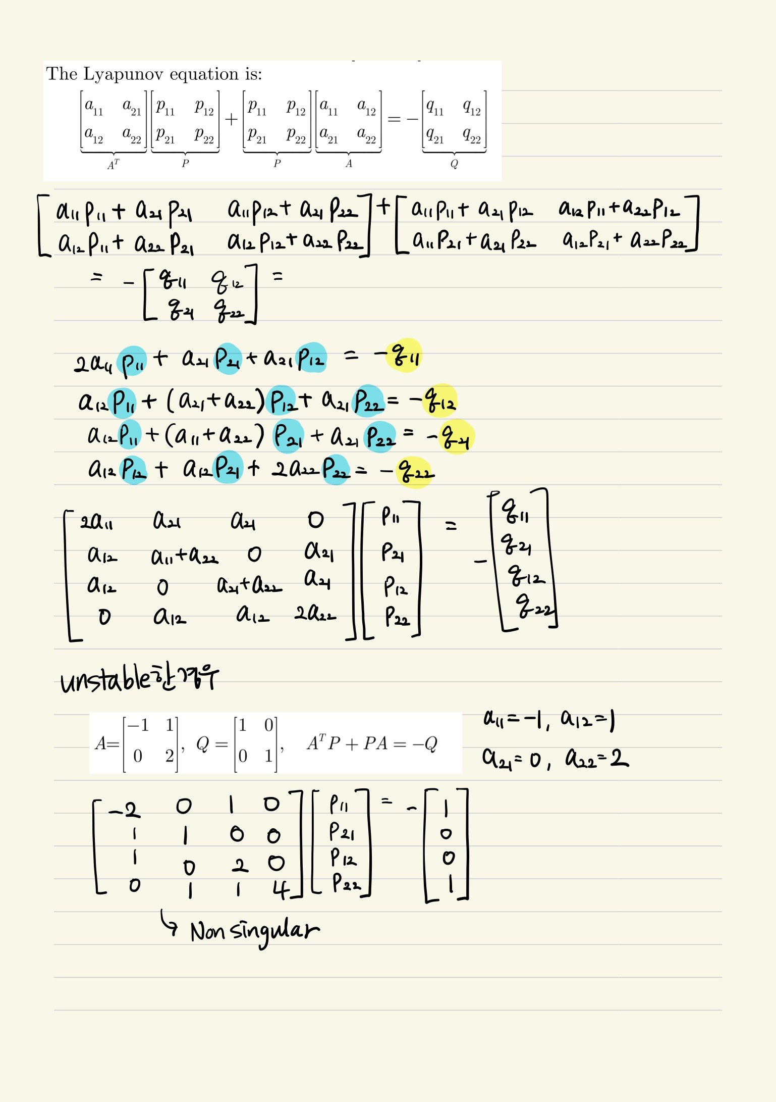 그림에서 위 내용은 lyapunov equation을 4 by 4 matrix로 바꿔놓은 것이고, 아래 내용은 이 식에서 앞서 본 예시들 중 unstable한 case를 대입해본 것입니다.
