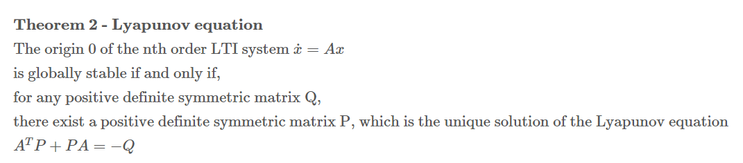 $\text{there exists a unique solution P that satisfies the Lyapunov equation, }$