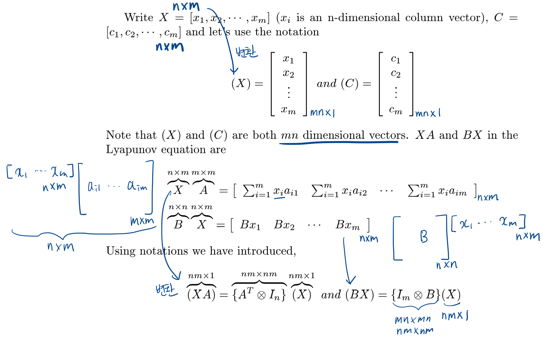 각 차원을 변형한 최종 공식은 밑에 나온 $\{A^{T}\otimes I_{n}+I_{m}\otimes B\}(X)=(C)$입니다.