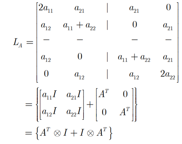 $L_{A}=\{A^{T}\otimes I +I\otimes A^{T}\}\in R^{n^{2}\times n^{2}}$