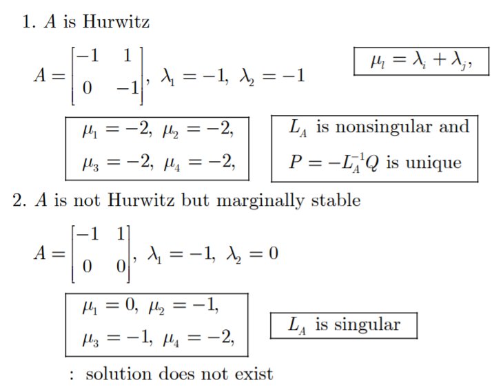 unique solution, $P$가 존재하더라도 A의 모든 eigenvalues의 real part가 음수인 것은 아닙니다. 즉, A가 stable하다는 것이 보장되지는 않습니다.