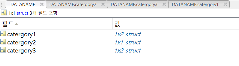 DATANAME이라는 structure 안에는 category1, category2, category3이라는 필드field가 존재하고 각 field는 자유롭게 데이터 타입을 가질 수 있습니다. 저는 필드 안에 또 structure를 만들겠습니다. category1는 A,B,C라는 field가 존재하고 category1(1), category1(2)는 category1의 요소element입니다. 이 element가 가지고 있는 field에 값(int, char, array 등)을 넣을 수 있습니다.