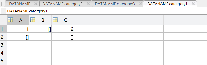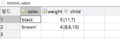 보시면 category1(위 그림에서는 오타가 났네요.)의 element 중 첫 번째(맨 왼쪽 label에서 1)에 필드 A에 1을 넣고, C에는 2를 넣었습니다. scalar값 말고 배열을 넣어도 들어갑니다. 또한 element 중 두 번째(category1(2)) 필드 B에 1을 넣었습니다. 필드는 만드는 순서대로 쌓이기 때문에 제가 코드를 A,B,C 순서대로 만들어서 저렇게 설정된 것입니다.