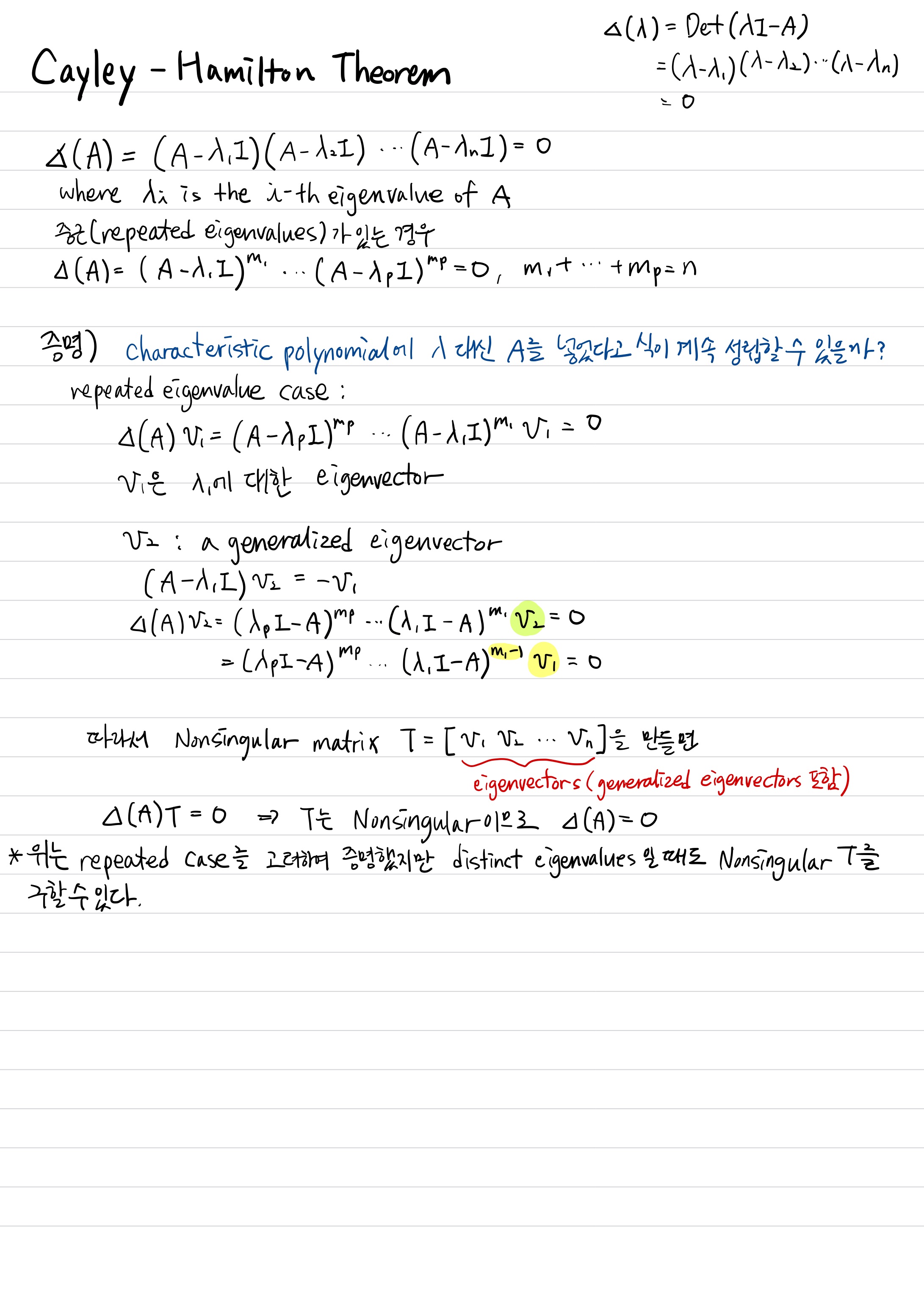 이 정리는 linearly independency를 다룰 때 많이 사용됩니다. 정리 증명은, $\Delta(\lambda)$에 $\lambda$ 대신 $A$를 집어넣으면 될 것으로 보이지만 $\lambda$가 scalar였기 때문에 증명을 할 필요성이 보입니다.