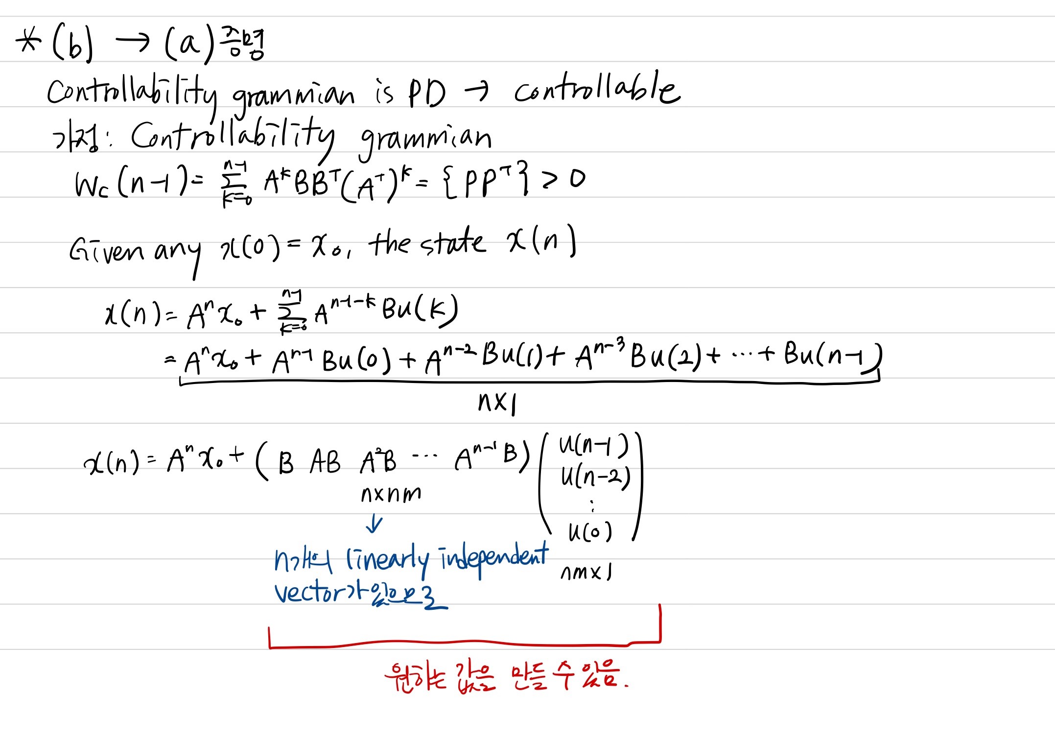 처음 state에서 내가 원하는 '어떤' target state를 finite step 안에 도달할 수 있으면 이 시스템은 controllable합니다.