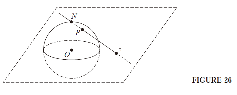 point at infinity를 포함하는 complex plane을 extended complex plane이라고 합니다. 이 complex plane이 적도면을 지나가도록 하는 unit sphere가 있습니다. complex plane 위에 놓인 점 z에 대해서 sphere의 north N을 잇는 line을 만듭니다. 이 line과 sphere가 만나는 교점을 P라고 합니다. N은 point at infinity라고 정해줌으로써, P와 extended complex plane에 놓인 z는 일대일 대응(one to one correspondence)이 됩니다. (이 sphere를 Riemann sphere, 이 correspondence를 stereographic projection라고 합니다.)