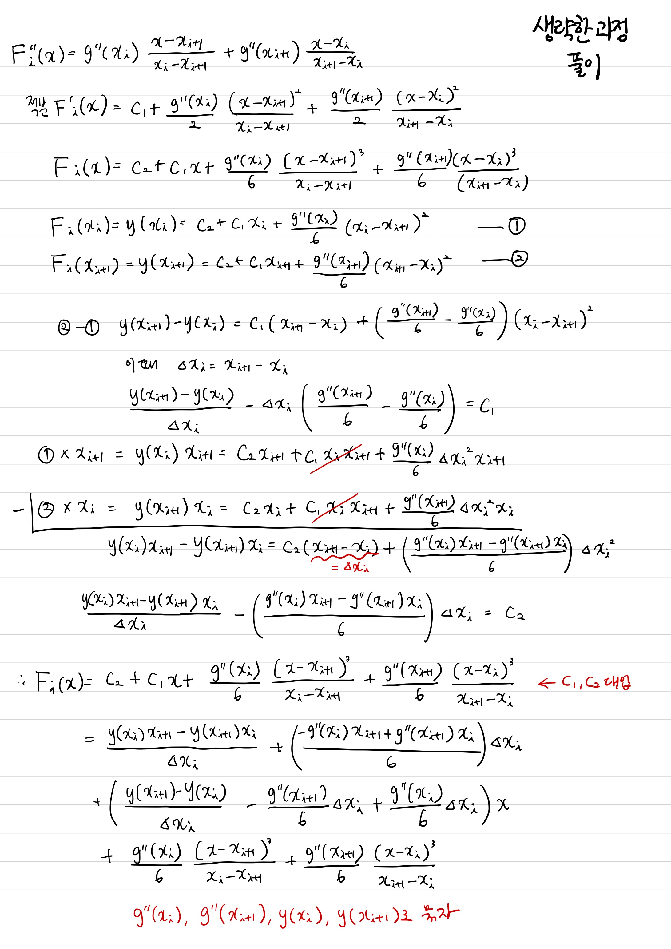 이렇게 나온 적분상수 $c_{1},c_{2}$는 $F_{i}(x_{i})=y(x_{i}) \text{ (1) }, F_{i}(x_{i+1})=y(x_{i+1})\text{ (2)}$을 대입해서 알아낼 수 있습니다.