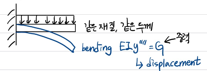 외부 힘이 중력만 작용하는 경우 이 시스템을 $EIy^{''''}=G \text{ , where y is displacement}$로 모델링할 수 있습니다.