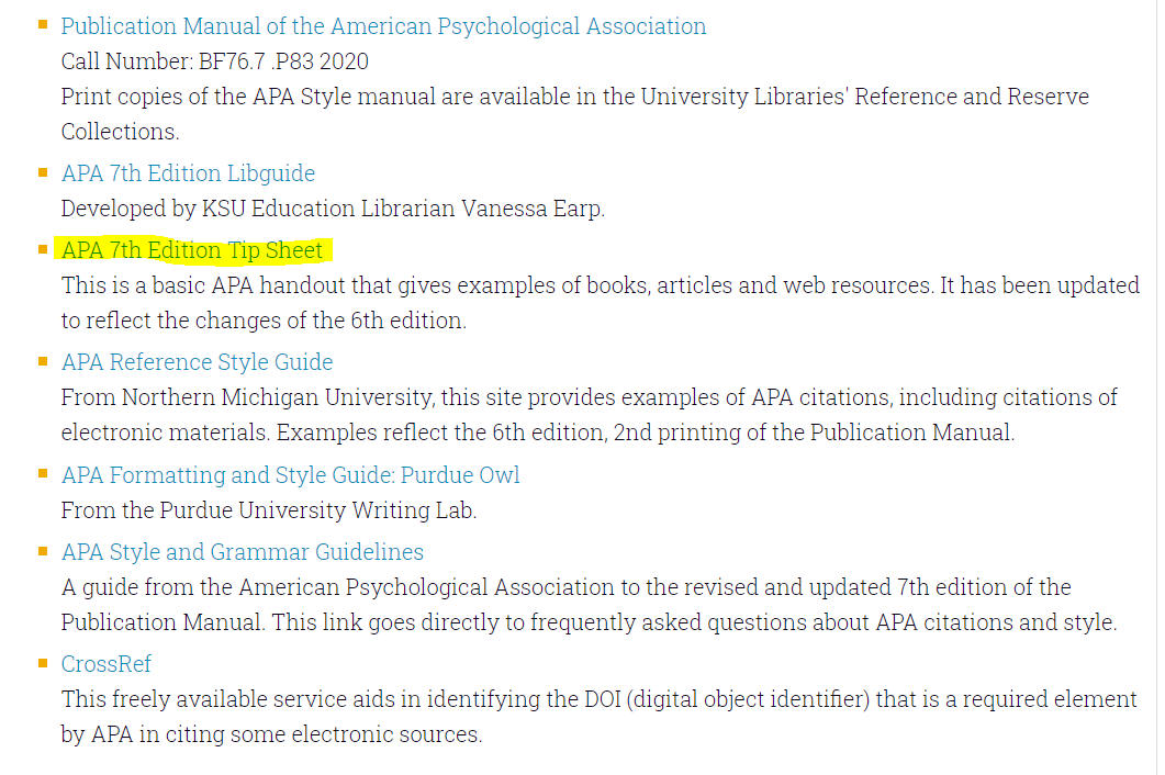 내가 제출하려는 저널이 APA 형식을 쓴다면, 몇몇 대학에서 자료를 정리해놓은 것이 있다. 나는 첫번째 링크인 kenn state libraries에서 tip sheet을 참고하고 있다. 각종 저널, e북, 인터넷 article 등을 어떻게 citation하는지 정보가 있으니 본인이 신경써서 숙지하는 수밖에 없다.